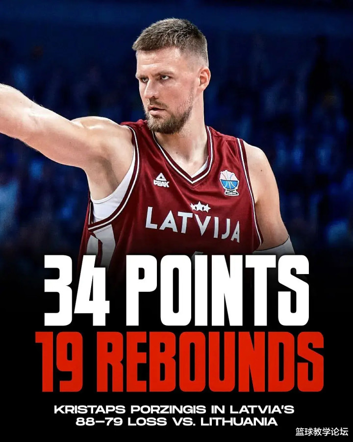 最后看看立陶宛和拉脱维亚这一场,首节战罢,立陶宛28-18领先10分。第二节两队战平,第三节拉脱维亚仅输2分,第四节净胜3分逆转失败。波尔津吉斯投篮22中10,三分8中4,罚球15中10,空砍34分19篮板2盖帽,正负值-10。