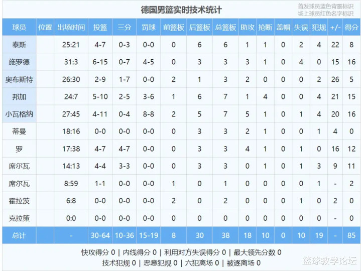 接下来说说另外一个夺冠热门德国队,比赛过程和大家想象的不一样:上半场打完,德国31-32落后葡萄牙1分。德国队上半场三分球18中1,堪称辣眼睛。第三节德国21-19完成反超,第四节德国轰出33-7,最终85-58淘汰葡萄牙!