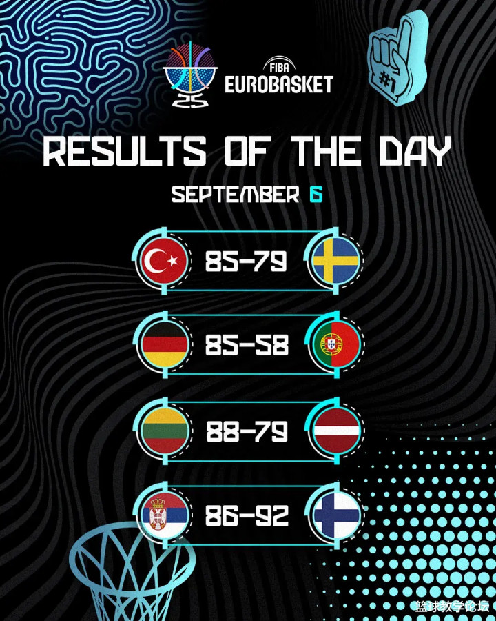 北京时间9月7日凌晨,男篮欧洲杯1/8决赛,有四场已经结束,先看比分:土耳其85-79击败瑞典;德国85-58大胜葡萄牙;立陶宛88-79战胜拉脱维亚;塞尔维亚86-92爆冷不敌芬兰。土耳其、德国、立陶宛和芬兰率先杀进八强!