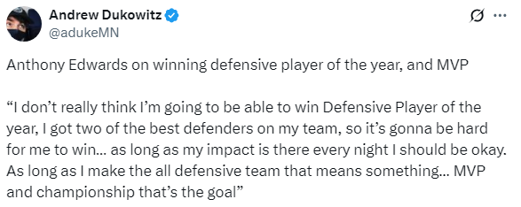 北京时间10月2日,NBA各支球队正在积极备战,森林狼当家球星爱德华兹透露自己的目标:我不太可能拿到DPOY,我的目标是MVP和总冠军。