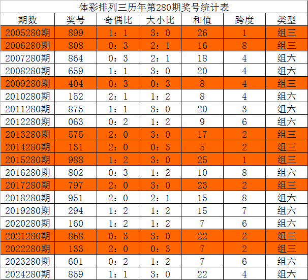 在历年排列三第280期开奖中:组三号码出现9次,组六号码出现11次。组三、组六号码出现比例持平,本期奖号形态关注:组六号码。