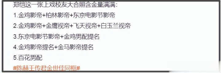 这张合影上有11个人,其中有8个都是大家熟悉的明星,如郑恺、彭昱畅 、陈赫、王传君、金世佳、雷佳音、王景春、杜江,也就是许大茂、阿如那等不熟,而这张含金量满满的照片也被吐槽是资源咖扎堆,王景春、王传君拿过国际电影节影帝,雷佳音拿过视帝,彭昱畅也拿过最佳男主,还有一些男配奖,不少网友还认为年纪轻轻且唯一不是表演系出身的彭昱畅能加入其中过于幽默。