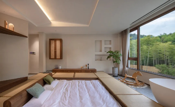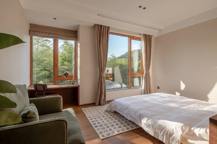 妙嬉的客房以简约风格为主,Loft 户型“朝朝”适合看日出,清晨阳光从二楼天窗洒进来,唤醒整座山林;家庭房“双双”有两张大床,还能加榻榻米,带娃出行也毫无压力。每个房间的超大落地窗都能将竹海、山景、庭院风光尽收眼底。