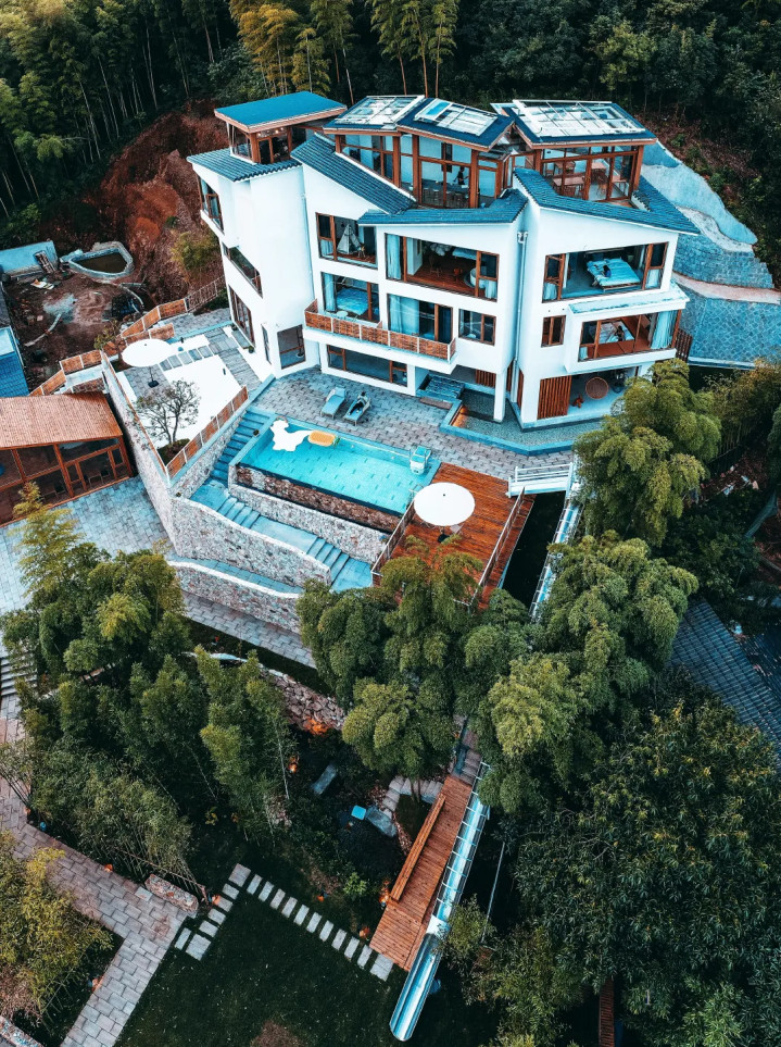在妙溪旁边的妙嬉Corgi泳池度假美宿(妙溪二期),是一座获过上海国际设计周金梁设计奖的民宿,把日系简约风与山野灵动感融合得恰到好处。民宿的主体建筑格外吸引眼球,纯净的米白色墙面与窗外的翠绿竹海形成鲜明对比,随手拍张照片,都是ins风大片,不用修图都像在海岛度假村。