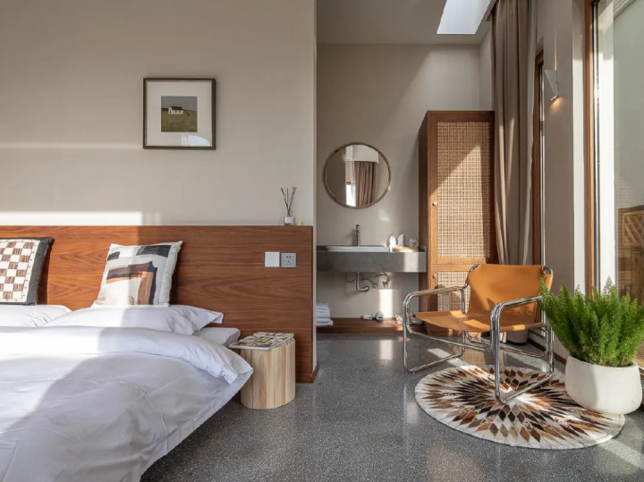 作为湖州唯一的全国甲级民宿,妙溪给我的第一印象是“结庐在人境,而无车马喧”的通透感。白墙原木的独栋别墅依山而建,被竹海与茶山温柔包裹,清晨推窗时,山间雾气会顺着落地窗的缝隙钻进来,带着草木的清香。