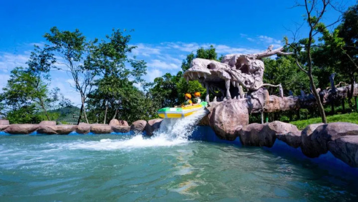 最绝的是泳池边的场景:天蓝色的池水映着白房子,坐在池边的遮阳伞下,吹着带着草木香的风,喝一口冰镇汽水,那一刻真的会产生错觉——仿佛下一秒就能听见海浪声,这种 “在山野里遇见海岛” 的惊喜,大概只有妙嬉能给。