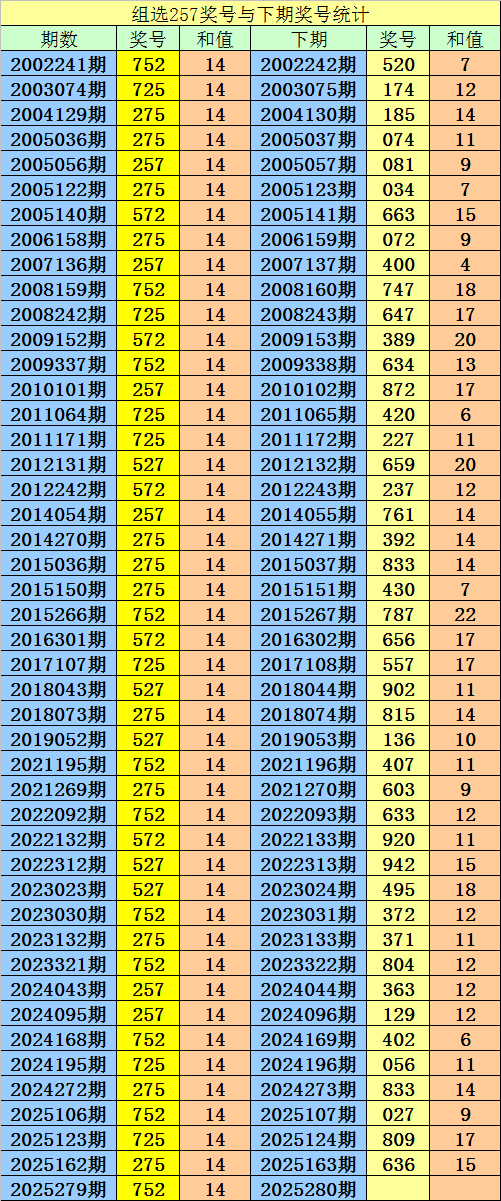 第2025279期3D奖号组选为:257,历史上该号码组选出现46次,下期号码分别为:520、174、185、074、081、034、663、072、400、747、647、389、634、872、420、227、659、237、761、392、833、430、787、656、557、902、815、136、407、603、633、920、942、495、372、371、804、363、129、402、056、833、027、809、636。