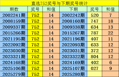 第2025279期3D奖号为:752,历史上该号码直选开出11次,下期号码分别为:520、747、634、787、407、633、372、804、402、027。