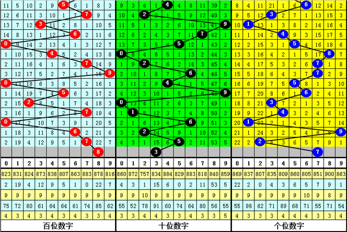 其中,号码0出现18次,1出现8次,2出现15次,3出现20次,4出现14次,5出现9次,6出现15次,7出现17次,8出现10次,9出现9次,奇偶比为63:72,奇数走冷,本期防止回补,奇偶比参考2:1;大小比为:60:75,大号出现频次较低,本期注意大号回补。